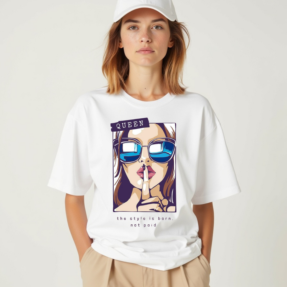 Make a bold statement with our Queen Graphic Oversized T-Shirt, designed for the fearless and fashionable. Featuring a vibrant pop-art style illustration of a confident woman with mirrored sunglasses and the powerful text "QUEEN", this tee captures attitude and elegance. Below the graphic, the quote “The style is born, not paid” adds a punch of personality.